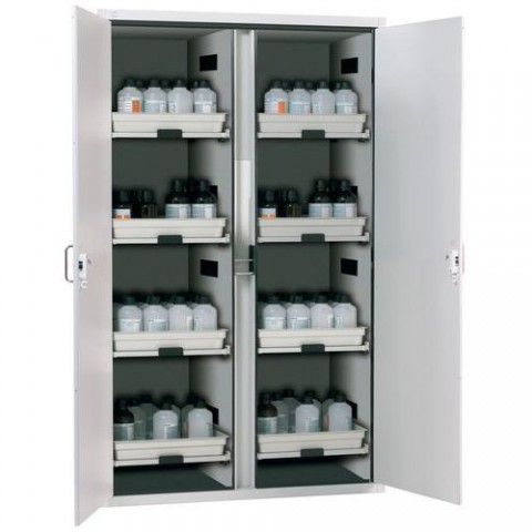 Vhodné pro bezpečné a předpisové skladování agresivních, nehořlavých látek. Robustní skříň s bezpečnostními prvky mimo skladovací oddíly pro zvýšení odolnosti proti korozi i jednoduché čištění. Dva hermeticky oddělené skladovací oddíly v jedné skříni např. pro skladování kyselin a louhů. Na vysouvatelných policích jsou umístěny polypropylenové vaničky. Integravovaná nekovová přípojka k externímu větracímu systému. Patky pro vyrovnání nerovností podlahy. Uzamykání celé skříňky centrálním zámkem. Konstrukce a dveře z ocelového plechu s povrchovou úpravou práškovým lakem v barvě šedá RAL 7035 nebo bílá RAL 9016. Nosnost jedné police je 25 kg.Skříně na žíraviny, 1965 x 1197 x 603 mm, PP, 2 oddíly