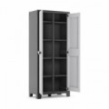Skříně se vyznačují použitím kovových pantů, které umožňují velmi přesné a těsné uzavírání dveří. Jsou vhodné k uschování nástrojů, nářadí apod. uvnitř budov. Vnitřní prostor lze měnit díky sklopným policím. Skříň je uzamykatelná visacím zámkem. rozměry v x š x h: 182 x 80 x 44 cm materiál: plast nosnost na polici: 30 kg počet polic: 4 ks barva: černá barva dveří: šedá sklopné police uzamykání visacím zámkem (není součástí dodávky), dodávka v demontovaném stavuPlastová dílenská skříň, 182 x 80 x 44 cm