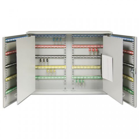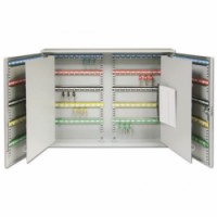 Ocelová uzamykatelná schránka určená k uložení klíčů s číslovaným seznamem na vnitřní straně dvířek. Příslušenství obsahuje samolepící čísla, identifikační schéma a upevňovací materiál.Skříňka na klíče, 300 háčků