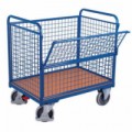 Vozík je vybaven třemi pevnými a jednou sklopnou stěnou. Všechny stěny včetně ložné plochy jsou vyrobeny z laminované dřevotřísky. Jednoduchá manipulace pomocí kovového madla. Pohyb zajišťují čtyři kola s valivými jehlovými ložisky, z nichž dvě jsou pevná a dvě otočná. Povrchová úprava práškovým lakem.Skříňový vozík s madlem a plnými stěnami, do 400 kg, 1 sklopná stěna