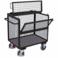 Vozík je vybaven třemi pevnými a jednou sklopnou stěnou. Otevírací víko lze uzamknout pomocí visacího zámku. Vozíky jsou opatřené mřížovými bočnicemi s oky velikosti 5 x 5 x 0,4 cm. Jednoduchá manipulace pomocí kovového madla. Pohyb zajišťují čtyři kola s valivými jehlovými ložisky, z nichž dvě pevná a dvě otočná kola. Povrchová úprava práškovým lakem.Uzavíratelný skříňový vozík s madlem a mřížovými stěnami, do 400 kg, 2 sklopné stěny