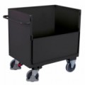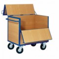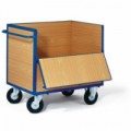 Skříňový vozík s výklopnou boční stěnou. Dvě madla na čelních stranách vozíku. Ložná plocha a stěny z MDF desek, výška stěny 71 cm. 2 pevná a 2 otočná kola s brzdou EasySTOP. Šedá kola z termoplastické pryže nezanechávající stopy na plastovém ráfku s přesnými kuličkovými ložisky.Skříňové vozíky s výklopnou stěnou, do 500 kg