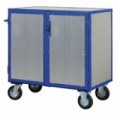 Uzamykatelný vozík s křídlovými dveřmi a cylindrickým zámkem. Stěny a horní víko jsou vyrobeny z pozinkovaného plechu o tloušťce 1 mm. Nosnost na polici je 120 kg, dvě ze tří polic lze výškově nastavit v rastru 10 cm. Jednoduchá manipulace pomocí kovového madla. Pohyb zajišťují čtyři kola s valivými jehlovými ložisky, z nichž dvě jsou pevná a dvě otočná. Povrchová úprava práškovým lakem.Uzavíratelný skříňový vozík s madlem a plnými stěnami, do 600 kg, 3 police