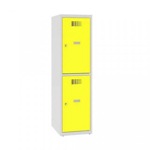 Snížené svařované šatní skříně se dvěma samostatně uzavíratelnými boxy. Jsou vhodné do škol a díky své výšce jsou ideální i pro žáky prvního stupně. Vyrobeny z ocelového plechu s povrchovou úpravou práškovým lakem. Skříně jsou vybaveny dvěma policemi na knihy a háčkem na oblečení. Větrací mřížky ve dveřích, úhel otevření dveří s bezpečnostní pojistkou max. na 90°, samolepicí štítek na jméno, možnost dokoupení horního šikmého nástavce. Uzamykání cylindrickým zámkem se dvěma klíči.Snížené školní šatní skříně, 2 oddíly, 400 mm, cylindrický zámek