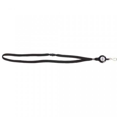 Šňůrka připevněná k navijáku se zapínáním na karabinu. Pro použití s visačkami.Šňůrka na krk s navijákem, černá