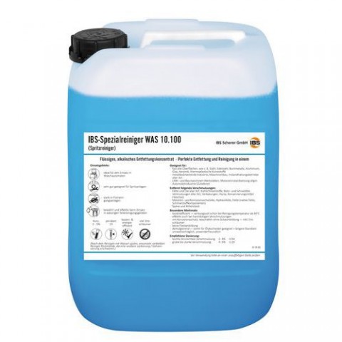Vysoce účinný alkalický odmašťovací koncentrát na vodní bázi pro široké využití v průmyslu. Účinně čistí povrchy jako jsou ocel, nerez, litina, neželezné kovy, hliník, sklo keramika nebo termoplasty. Odstraňuje oleje všeho druhu - motorové, mazací, hydraulické, dále tuky, pryskyřice, konzervační vosky, železné hobliny a běžný prach. Vhodné použití v mycích automatech, nástřikových a ponorových čisticích linkách a mycích stolech na vodní bázi. S ochranou proti korozi, včetně odpěňovače. Doporučené dávkování při lehkém až středním znečištění 2 - 3 %, při vysokém znečištění 4 - 5 %. Čisticí kapalina splňuje požadavky týkající se odpadních vod ÖNORM B 5104, B 5105 a B 5106.Speciální čisticí kapalina IBS WAS 10.100, nástřikový čistič, 20 l