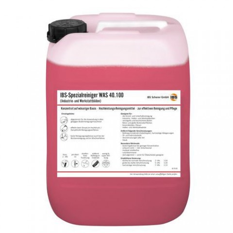 Mycí koncentrát pro základní údržbu a čištění průmyslových podlah, podlah v halách z betonu, keramiky, dlažby, podlah s povrstvením nebo uzavíracím nátěrem. Čistič vyvinutý pro použití ve veškerých běžně používaných podlahových mycích strojích, vysokotlakých čističích, vhodný rovněž pro kartáčové čištění a stírání. Účinně odstraňuje oděrky z pneumatik (vysokozdvižných vozíků), ztvrdlé usazeniny, oleje, tuky a prach. Nepění a zanechává podlahu beze šmouh. Doporučení dávkování při lehkém až středním znečištění 2 - 4 %, silném znečištění 5 - 6 %, velmi silném znečištění 7 - 8 %. Čisticí kapalina splňuje požadavky týkající se odpadních vod ÖNORM B 5104, B 5105 a B 5106.Speciální čisticí kapalina IBS WAS 40.100, na dílenské podlahy, 20 l