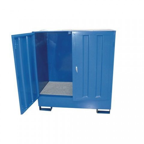 Stanice pro bezpečné skladování materiálů v interiéru i exteriéru. Krytá stanice pro skladování nebezpečných materiálů s dvojitými uzamykatelnými dveřmi. Kapacita 2x 200 l sudy.Stanice na nebezpečné látky