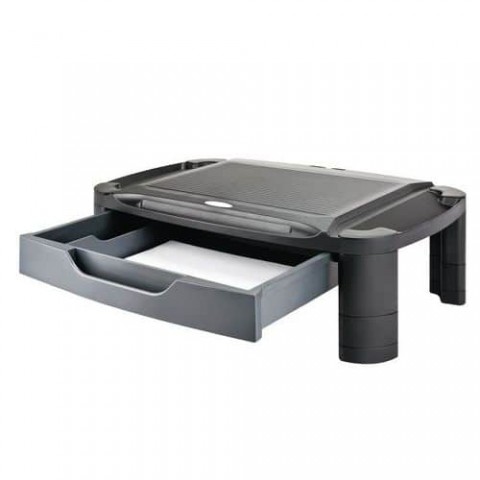 Stojan, který zlepšuje ergonomii vašeho stolu. Zásuvky a úložné prostory po stranách. Pojme také tablet a smartphone. Výška se nastavuje pomocí přiložených distančních prvků (výška 9,3 cm, 13,3 cm nebo 17,3 cm)Stojan na monitor DESQ se zásuvkou