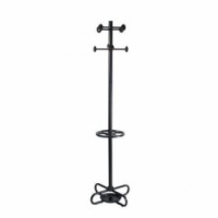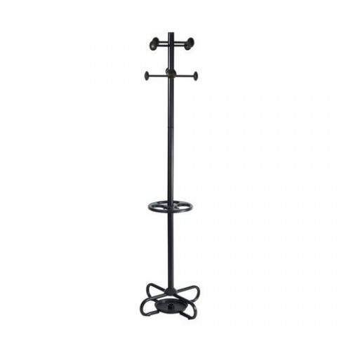 Volně stojící věšák vhodný do předsíní, kanceláří nebo vstupních hal. Stabilní kovová konstrukce s kovovou základnou a detaily z plastu v černé barvě. Stojan tvoří osm háků na oděvy a držák na deštníky. Povrchová úprava práškovým lakem.Stojanový věšák Ryan