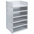 Přihrádky lze postavit a stohovat vertikálně nebo vedle sebe. Přední hrana zajišťuje dokumenty a slouží k indexaci.Přihrádkový modul Exacompta, 6 přihrádek