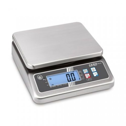 Stolní váhy FOB z nerezové oceli se širokým rozsahem vážení a vysokým krytím IP67 proti prachu a stříkající vodě. Kompatibilní s vaším systémem kvality vyhovujícím HACCP. Provoz na baterie 4× 1,5 V AA, doba provozu až 48 h.Stolní váhy Kern FOB
