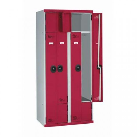 Svařovaná šatní skříň skládající se ze čtyř samostatně uzamykatelných oddílů k uložení osobních věcí. Každý oddíl obsahuje tyč na oděvy a samostatnou přihrádku. Otevírání dveří až do 180°. Zvýšená bezpečnost díky 2-bodovému zámku (2 klíče jsou součástí dodávky). Ventilace zepředu. Otvory pro spojení více skříní k sobě. Možnost umístění štítku se jménem.Svařovaná šatní skříň, dveře Z, 4 oddíly, cylindrický zámek