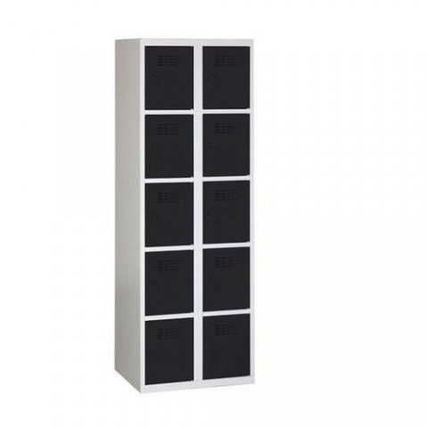 Svařované boxové skříně s odlehčenou konstrukcí a výztuhami zajišťujícími dobrou stabilitu. Vhodné pro odkládání osobních věcí na pracovištích, kulturních akcích, v převlékárnách apod. Vyrobeno z ocelového plechu tloušťky 0,5 mm. Perforovaná dvířka zajišťují účinné odvětrávání vnitřního prostoru. Dvířka jsou zavěšena na vnitřních pantech. Jednotlivé boxy jsou samostatně uzamykatelné cylindrickým zámkem s možností výměny za otočný uzávěr (nutno dokoupit zvlášť). Vnitřní prostor boxů je hladký a snadno udržovatelný. Možnost umístění štítku se jménem.Svařované šatní skříně Eric odlehčené, 10 boxů, cylindrický zámek
