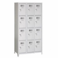 Svařované boxové skříně s odlehčenou konstrukcí a výztuhami zajišťujícími dobrou stabilitu. Vhodné pro odkládání osobních věcí na pracovištích, kulturních akcích, v převlékárnách apod. Vyrobeno z ocelového plechu tloušťky 0,5 mm. Perforovaná dvířka zavěšená na vnitřních pantech zajišťují účinné odvětrávání vnitřního prostoru. Jednotlivé boxy jsou samostatně uzamykatelné cylindrickým zámkem s možností výměny za otočný uzávěr (nutno dokoupit zvlášť). Možnost umístění štítku se jménem.Svařované šatní skříně Eric odlehčené, 12 boxů, cylindrický zámek