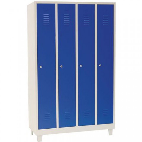 Svařované šatní skříně prémiové kvality skládající se ze čtyř samostatně uzamykatelných oddílů. Bezpečnost zvyšuje zejména vyztužení dveří po celé délce, a to včetně rámu, a perforace dveří, kterými nelze pohlédnout dovnitř. Šatník z ocelového plechu tloušťky 0,7 mm. Účinné odvádění vlhkosti z oděvů větracími otvory na dveřích. Dveře jsou uloženy na vnitřních výsuvných pantech s možností otevření dveří až 180° a jsou opatřeny plastovými nárazníky pro snížení hluku při zavírání. Uzamykání otočným uzávěrem na visací zámek (lze dokoupit jako příslušenství) nebo cylindrickým zámkem na klíč. Možnost umístění štítku se jménem v horní části dveří. Na nohách výšky 10 cm. Možnost dokoupení šikmé stříšky.Svařované šatní skříně Manutan Expert DURO PROFI na nohách, 4 oddíly