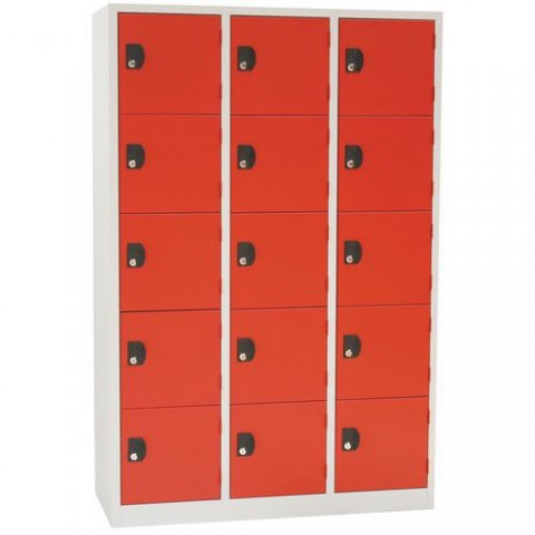 Svařované šatní skříně s boxy vhodné pro odkládání osobních věcí zaměstnanců na pracovištích, v převlékárnách nebo sportovních klubech. Konstrukce z ocelového plechu tloušťky 0,7 mm s výztuhami zajišťuje dobrou stabilitu. Účinné odvádění vlhkosti z oděvů větracími otvory zadní straně boxů. Dvířka boxů jsou zavěšená na vnějších pantech a jsou opatřeny plastovými nárazníky pro snížení hluku při zavírání. Možnost umístění štítku se jménem v plastovém úchytu na dveřích.Svařované šatní skříně Manutan Expert Mike, 15 boxů, cylindrický zámek