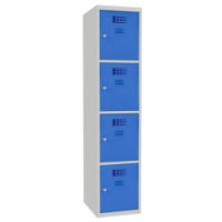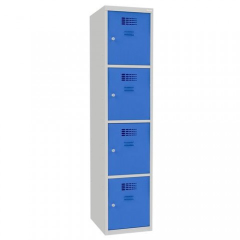 Svařované šatní skříně s boxy v několika barevných variantách, vhodné pro odkládání osobních věcí zaměstnanců na pracovištích, v převlékárnách nebo sportovních klubech. Odlehčená konstrukce z ocelového plechu tloušťky 0,5 mm s výztuhami zajišťuje dobrou stabilitu. Účinné odvádění vlhkosti z oděvů větracími otvory na dveřích. Dvířka boxů jsou zavěšená na vnitřních pantech. Uzamykání každého boxu cylindrickým zámkem, který je možné vyměnit za otočný uzávěr. Možnost umístění štítku se jménem v horní části dveří.Svařované šatní skříně Oskar, 4 boxy, cylindrický zámek