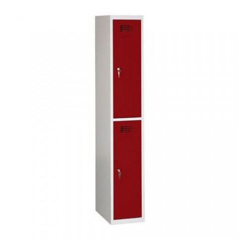Svařované boxové skříně s odlehčenou konstrukcí a výztuhami zajišťujícími dobrou stabilitu. Vhodné pro odkládání osobních věcí na pracovištích, kulturních akcích, v převlékárnách apod. Vyrobeno z ocelového plechu tloušťky 0,5 mm. Perforovaná dvířka zavěšená na vnitřních pantech zajišťují účinné odvětrávání vnitřního prostoru. Jednotlivé boxy jsou samostatně uzamykatelné cylindrickým zámkem s možností výměny za otočný uzávěr (nutno dokoupit zvlášť). Možnost umístění štítku se jménem.Svařované šatní skříně Rafael odlehčené, 2 oddíly, cylindrický zámek