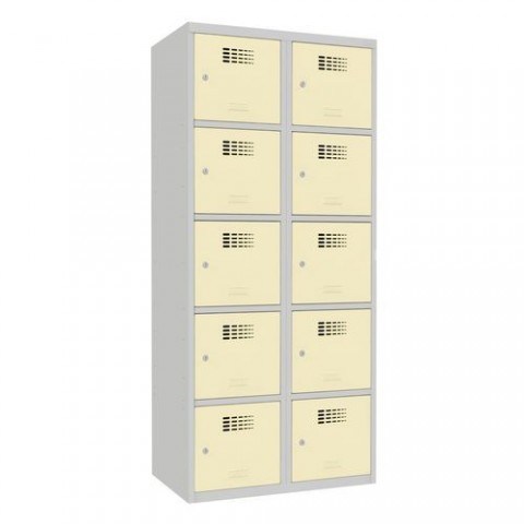 Svařované šatní skříně s boxy v několika barevných variantách, vhodné pro odkládání osobních věcí zaměstnanců na pracovištích, v převlékárnách nebo sportovních klubech. Odlehčená konstrukce z ocelového plechu tloušťky 0,5 mm s výztuhami zajišťuje dobrou stabilitu. Účinné odvádění vlhkosti z oděvů větracími otvory na dveřích. Dvířka boxů jsou zavěšená na vnitřních pantech. Uzamykání každého boxu cylindrickým zámkem, který je možné vyměnit za otočný uzávěr. Možnost umístění štítku se jménem v dolní části dveří.Svařované šatní skříně Samuel, 10 boxů, cylindrický zámek