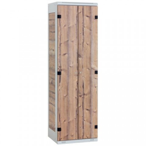 Šatní skříňky skládaj??cí se ze dvou samostatně uzamykatelných oddílů. Atraktivní design vhodný do kanceláří, škol, fitness center, nemocnic, aquaparků apod. Šatník je vyroben ze svařeného ocelového plechu o tloušťce 0,8 - 1 mm, boční výplně a dveře z laminovaných dřevotřískových desek o tloušťce 18 mm, hrany chráněny 2 mm ABS hranou. Účinné odvádění vlhkosti z oděvů větracími otvory v horní a spodní části korpusu. Dveře jsou uloženy na vnějších pantech s možností otevření dveří až 170°. Uzamykání otočným cylindrickým zámkem na klíč. Každý samostatný oddíl je vybaven dvěma policemi a chromovanou tyčí na ramínka.Svařované šatní skříně Tony I, 2 oddíly, cylindrický zámek