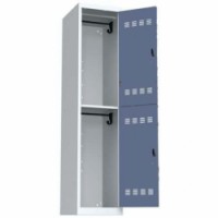Více-oddílová šatní skříň svařovaná z ocelového plechu tloušťky 0,7 mm. Každý oddíl je vybaven tyčí na ramínka a dvěma háčky (uzamykání cylindrickým zámkem se dvěma klíči). Perforovaná dvířka zajišťují účinné odvětrávání vnitřního prostoru. Možnost umístění štítku se jménem.Svařované šatní skříně Vinco, 1 sloupec, 2 boxy, 400 mm, cylindrický zámek
