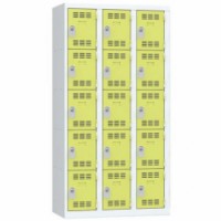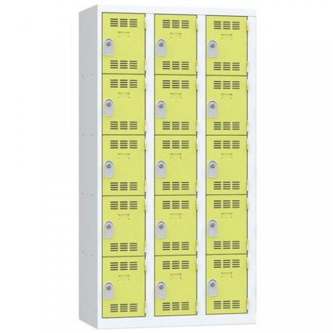 Více-oddílová šatní skříň svařovaná z ocelového plechu tloušťky 0,7 mm. Jednotlivé oddíly jsou samostatně uzamykatelné cylindrickým zámkem se dvěma klíči. Perforovaná dvířka zajišťují účinné odvětrávání vnitřního prostoru. Možnost umístění štítku se jménem.Svařované šatní skříně Vinco, 3 sloupce, 15 boxů, 300 mm, cylindrický zámek