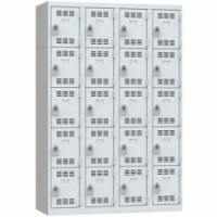 Více-oddílová šatní skříň svařovaná z ocelového plechu tloušťky 0,7 mm. Jednotlivé oddíly jsou samostatně uzamykatelné otočným uzávěrem na visací zámek (není součástí dodávky). Perforovaná dvířka zajišťují účinné odvětrávání vnitřního prostoru. Možnost umístění štítku se jménem.Svařované šatní skříně Vinco, 4 sloupce, 20 boxů, 300 mm, otočný uzávěr