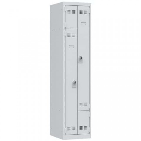 Svařovaná šatní skříň Vinco se zvýšenou bezpečností k uložení osobních věcí. Každý oddíl obsahuje tyč na oděvy, dva háčky a samostatnou přihrádku. Uzamykání trojbodovým systémem s otočným uzávěrem na visací zámek (není součástí dodávky). Ventilace ve dveřích, možnost umístění štítku se jménem.Svařované šatní skříně Vinco, dveře Z, 2 oddíly, otočný uzávěr