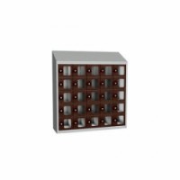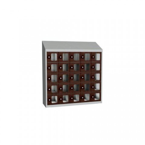 Svařované boxové skříně s malými schránkami s průzorem z plexiskla na osobní věci nebo ke skladování svačin a obědů. Jednotlivé schránky jsou samostatně uzamykatelné cylindrickým zámkem na klíč. Možnost umístění štítku se jménem nebo osobním číslem. Opatřeny horním šikmým nástavcem, otevírání dvířek až do úhlu 110°. Upevnění na zeď, vytvoření větších bloků spojením více skříní dohromady. Rozměry průzoru v x š - 117 x 95 mm.Svařované skříně na osobní věci Olaf s průhlednými dvířky, 25 boxů, cylindrický zámek