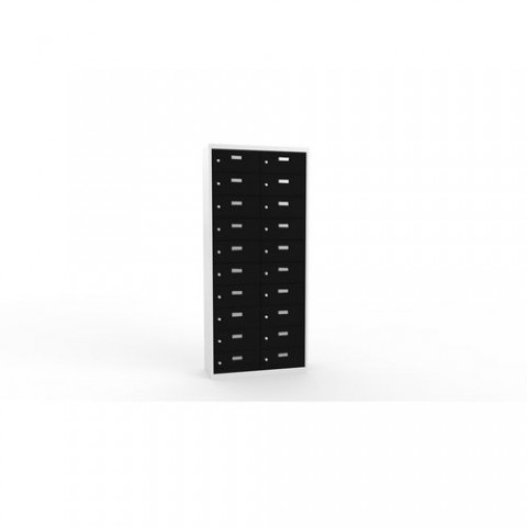 Skříně ze svařovaného plechu s malými schránkami na uložení osobních věcí. Vhodné do kantýny, posiloven, fitness center, bazenů nebo recepce hotelů. Jednotlivé schránky jsou samostatně uzamykatelné cylindrickým zámkem na klíč. Možnost vložení štítku se jménem nebo číslem na dvířka každé schránky.Svařované skříně na osobní věci Ron II, 20 boxů, cylindrický zámek
