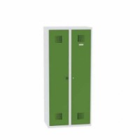 Svařované skříňky vhodné pro uložení úklidových pomůcek. Levé a pravé otevírání dveří umožňuje rychlý přístup do celé skříňky. Skříň je rozdělená na dva oddíly, z nichž jeden je vybaven čtyřmi policemi a druhý oddíl má jednu polici v horní části skříně. Vyrobené z ocelového plechu tl. 0,5 mm s vyztuženými svary. Účinné odvádění vlhkosti ventilačními otvory na dveřích skříně. Uzamykání na pravém křídle jednobodovým cylindrickým zámkem, levé křídlo má otevírání hliníkovým knoflíkem. Možnost umístění štítku se jménem v horní části dveří. Povrchová úprava práškovou barvou.Svařované úklidové skříně Chloe, 2 oddíly, šířka 800 mm, cylindrický zámek