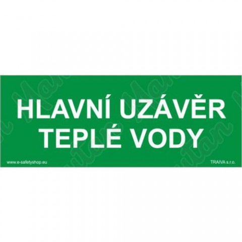 Bezpečnostní značení tabulkou, značkou nebo samolepkou "Hlavní uzávěr teplé vody" tiskneme na vysoce kvalitním materiálu, barvami s vysokou odolností proti otěru a UV záření. Tím zajišťujeme splnění požadavků Nařízení vlády č. 375/2017 Sb., ČSN ISO 3864-1, ČSN ISO 3864-2, ČSN ISO 3864-3, ČSN ISO 3864-4.Tabulky bezpečí - Hlavní uzávěr teplé vody