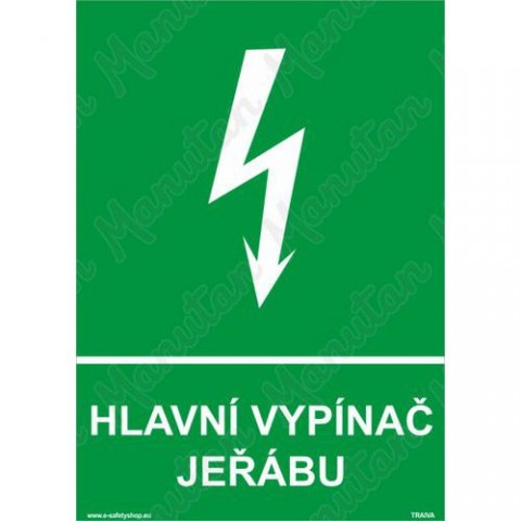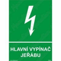 Bezpečnostní značka, tabulka nebo samolepka "Hlavní vypínač jeřábu" je tištěna na vysoce kvalitním materiálu, barvami s vysokou odolností proti otěru a UV záření. Provedení plně odpovídá požadavkům právních a technických předpisů, zejména Nařízení vlády č. 375/2017 Sb., ČSN ISO 3864-1, ČSN ISO 3864-2, ČSN ISO 3864-3, ČSN ISO 3864-4. Tyto tabulky musí být na pracovišti umístěny na dobře viditelných místech, pokud možno v bezprostřední blízkosti zařízení jehož se informace týká. Text doplňkové značky tabulky je možno, podle konkrétních podmínek, upravit (upřesnit) nebo změnit. Bezpečnostní informační tabulky "HLAVNÍ VYPÍNAČ JEŘÁBU" jsou určeny zejména k poskytnutí důležité informace o umístění hlavního vypínače jeřábu, jakožto ovládacího zařízení nutného v případě vzniku a likvidace mimořádné události.Tabulky bezpečí - Hlavní vypínač jeřábu