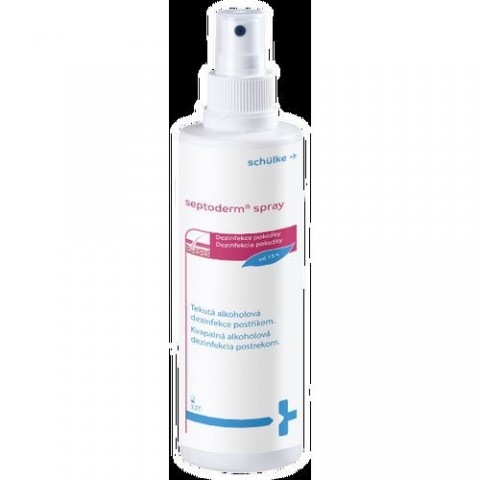 Tekutá alkoholová dezinfekce postřikem Septoderm spray 250ml. Dezinfekce pokožky před vpichy a zákroky porušujícími integritu kůže. Výborná snášenlivost s pokožkou. Snadná aplikace pomocí rozprašovače. Rychlý a dlouhotrvající účinek. Vhodný také k dezinfekci nohou a obuvi.Tekutá alkoholová dezinfekce postřikem Septoderm spray 250ml