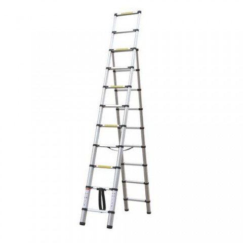 Teleskopický žebřík ze dvou dílů s 9 a 11 příčkami, vhodný pro profesionální i domácí použití. Každá příčka je opatřená pojistkami zamykacího mechanismu pro nastavení délky žebříku. Lze jej složit do minimální úložné velikosti.Teleskopický hliníkový žebřík, 9 + 11 příček