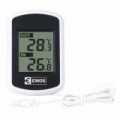 Digitální teploměr se zobrazením vnitřní a venkovní teploty pomocí drátové sondy v délce 2 m. Měření vnitřní teploty od 0 do 60 °C a venkovní teploty od -40 do 60 °C. Možnost upevnění na zeď.Digitální teploměr Emos E0041