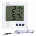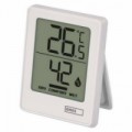 Digitální drátový teploměr se zobrazením vnitřní a venkovní teploty a vlhkosti. Drátová sonda s délkou 2,9 m. LCD displej s velkými číslicemi, rozměry displeje 46 x 61 mm. Přesnost měření 0,1 °C, možnost přepínání jednotek °C/°F. Indikace teploty v interiéru od 0 do 50 °C, v exteriéru od -40 do 60 °C. Měření vlhkosti v interiéru v rozmezí 25 až 95 % RV. Zařízení informuje o aktuálním čase a zároveň lze nastavit budík. Instalace na zeď nebo lze postavit na stůl či komodu pomocí stojánku. Napájení 1 x 1,5 V AAA.Digitální teploměr Emos E0121