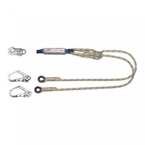 Tlumič pádu z 32 mm širokého popruhu s upevňovacími smyčkami na obou koncích, z nichž jedna je připojena k lanu a druhá ke karabině. Lano o průměru 12 mm disponuje našitými smyčkami na obou koncích, z nichž jedna je nastavitelná pomocí kovové spony. Otvory karabin jsou 18 mm (1 x) a 50 mm (2 x).Tlumič pádu ABM se 2 lany a 3 karabinami