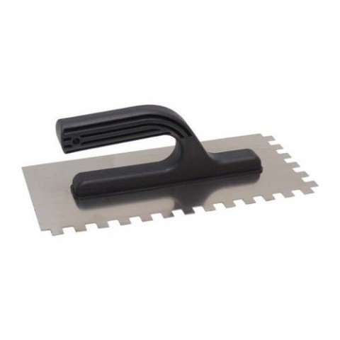 Hladítko na nanášení lepidel pod obklady a dlažby, dále pak k nanášení stěrek, štuků, omítek, tmelů a dalších stavebních hmot.TOPTRADE hladítka nerezová, s plastovou rukojetí, 270 x 130 mm, hobby