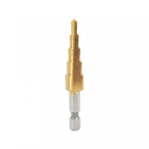 Dílenský vrták pro běžné vrtání do kovu. 5 stupňů = 4, 6, 8, 10, 12 mm Maximální tloušťka vrtání : 4 mmTOPTRADE vrták stupňový, HSS, do kovu, 4 – 12 mm, 5 stupňů