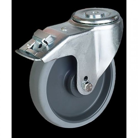 Pojezdová kola s běhounem z termoplastického elastomeru Ecoforma®. Běhoun má nízký válivý odpor a je odolný vůči chemikáliím a páře. Nezanechává stopy a dobře odolává nečistotám jako jsou kovové hobliny. Tvrdost běhounu je 70° Shore A.TPE transportní kola se středovým otvorem, průměr 160 - 200 mm, otočná s brzdou, kuličková ložiska