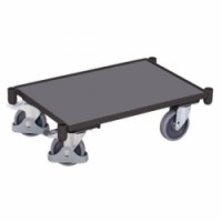 Transportní plošina vhodná pro umístění přepravek o rozměru 600 x 400 mm. Ložná plocha z MDF desky, okraj 10 mm. Čtyři otočná kola, z nichž dvě jsou opatřená brzdou. Šedá kola z termoplastické pryže nezanechávající stopy na plastovém ráfku s přesnými kuličkovými ložisky, ochrana nohou.Transportní plošiny, do 250 kg, 10mm hrana, 67,5 x 41,5 x 20,5 cm