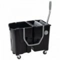 Dvojitý kbelík na kolečkách se ždímačem. Kbelík je oddělený příčkou na špinavou a čistou vodu, v jednom se nachází plochý ždímač. Vypouštěcí ventil ve spodní části kbelíku. Mobilitu zajišťují 4 otočná kola o průměru 50 mm a plastový úchyt.Úklidový kbelík na kolečkách Manutan Expert s pákovým ždímačem, objem 2 x 15 l