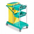 Víceúčelový úklidový vozík pro úklid středně velkých až velkých prostorů. Dvě velká vědra a dvě malá v červené a modré barvě. Opatřen čtyřmi otočnými koly, držákem na odpadkové pytle a poličkou.Úklidový vozík s pákovým ždímačem, objem 2 x 15 l + 2 x 6 l