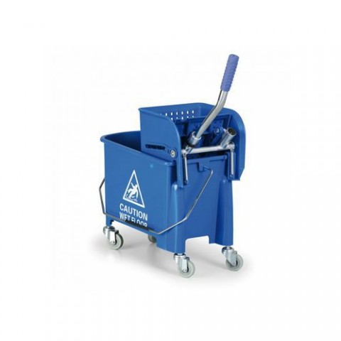 Plastový pojízdný kbelík s pákovým ždímačem vhodný pro ploché mopy do 40 cm. Kbelík je vyroben z polypropylenu, ždímač s prvky z chromované oceli. Opatřen kovovým madlem s rukojetí. Kbelík je možné rozdělit na dvě části pomocí vsunutí přepážky z polypropylenu. Mobilitu zajišťují 4 otočná kolečka o průměru 50 mm.Úklidový kbelík na kolečkách s pákovým ždímačem, 20 l