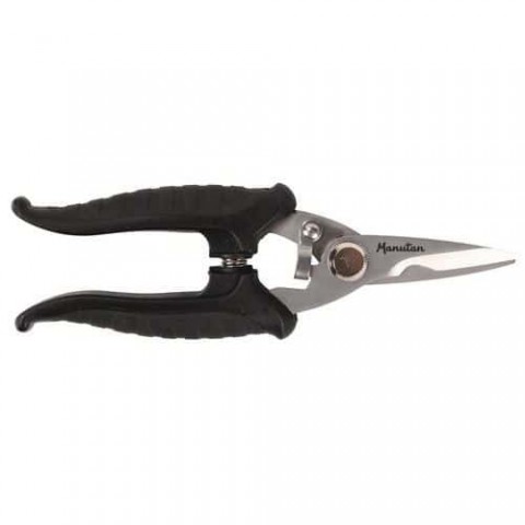 Rovné stříhací nůžky se zkosenými čepelemi s univerzálním použitím. Vhodné pro střih růží, kartonu, plastu, gumy nebo tenkých plechů a hliníku do tloušťky 1 mm. Protiskluzová rukojeť s pružinou pro flexibilní použití a pohodlné uchopení. Uzamykací systém pojistkou v zavřené poloze.Univerzální nůžky Manutan Expert