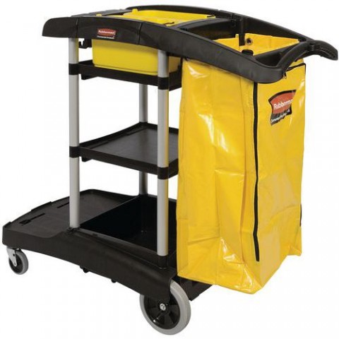 Velkokapacitní úklidový vozík se žlutým vakem (128 l), integrovanými gumovými madly, 2 kbelíky a háčky. Vybaven 2 pevnými koly a 2 otočnými koly, která nezanechávají stopy.Velkokapacitní úklidový vozík_Rubbermaid