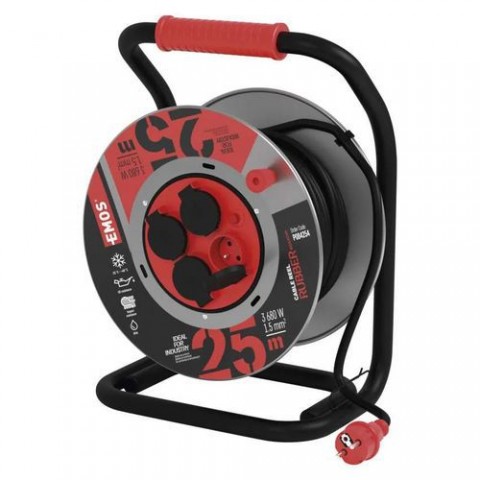 Venkovní prodlužovací kabely s délkou 25 nebo 50 metrů. Tělo navíjáku je vyrobeno z odolného kovu. Snadné navíjení kabelu díky vodícímu oku. Brzda pro aretaci cívky zabraňuje samovolnému navíjení a fixuje kabel přesně tak, jak potřebujete. Kabel s průřezem 1,5 mm2 odolá vodě, vlhku a studeným i horkým teplotám od -25 °C do +60 °C. Vhodný pro profesionální využití například ve stavebnictví nebo zemědělství, kde dochází ke střednímu až velkému mechanickému namáhání. Zapojení až čtyř elektrických zařízení současně. Tepelná pojistka chrání připojené elektrické zařízení před přetížením v síti, které může způsobit poškození přístrojů. Stupeň krytí IP44 značí odolnost proti vodě stříkající ve všech směrech. Zatížení navinutého kabelu je 230 V~: 4,35 A max./1 000 W. Zatížení plně rozvinutého kabelu 230 V~: 13,04 A max./3 000 W.Venkovní prodlužovací kabely na bubnu, 4 zásuvky, guma - neopren, 1,5 mm2