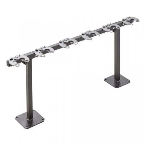 Stojan pro 6 koloběžek s možností uzamčení. Zamyká se visacím zámkem (U) nebo lankovým zámkem. Montáž na stěnu nebo ukotvení k podlaze. Rychlá a snadná instalace.Venkovní stojany na koloběžky Mottez, 6 míst, uzamykatelné